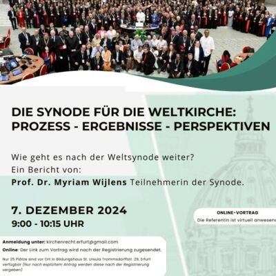 Am 7.12.2024 fand im Rahmen unseres "Aufbaukurses Theologie" und in Kooperation mit der Universität Erfurt ein online-Bericht von Frau Prof. Dr. Myriam Wijlens statt.